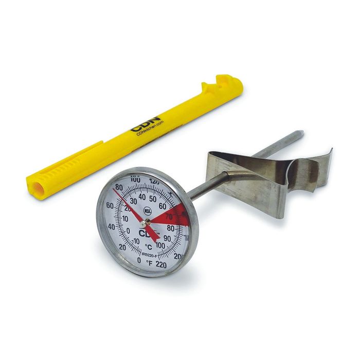 For small frothing jug. NSF Certified. Calibratable. Safe for commercial dishwashers. 12.7cm stem 3.8cm magnified dial. -18 to 104°C.