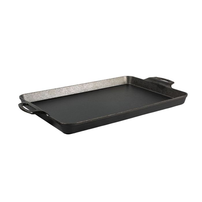This cast iron baking pan has two handles for easy lifting around the kitchen. Its naturally seasoned baking surface won't dent, bend, or warp in the oven, making it perfect for baking cookies, focaccia, and pizza.. even roasting vegetables. Crafted in America with iron and oil, use this baking pan to cook for generations. It provides excellent heat distribution and retention for consistent, even cooking. Seasoned and ready to use.