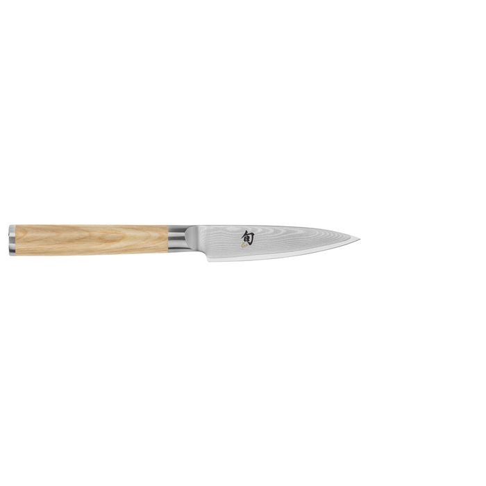 The beautiful Shun Classic Paring Knife in an ashwood-coloured handle has a small pointed blade well suited for precise tasks such as trimming and peeling fruit and vegetables.