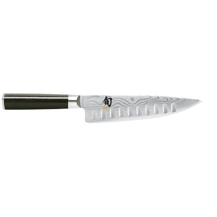 The Shun Classic Granton Chefs Knife is shaped in the traditional European style and is an all purpose knife suitable for chopping, shredding, cutting, slicing and cubing all meat, fish and vegetables. The Granton (or scalloped) blade eases cutting and helps separate food from the blade.